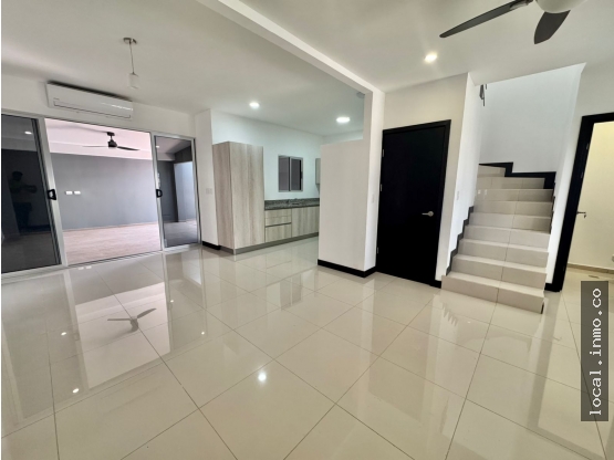 Al entrar, encontramos un espacio amplio de sala-comedor con A/C, cocina abierta con mucho espacio de almacenamiento, una terraza espaciosa, área de lavandería, medio baño de visitas y bodega.